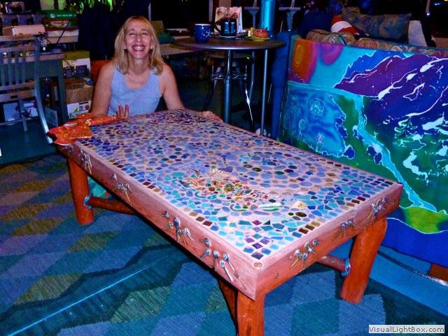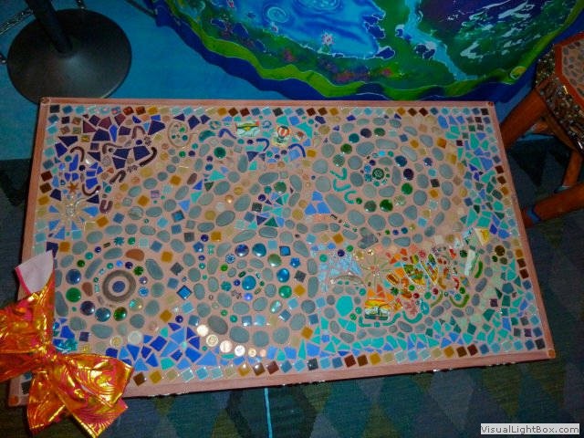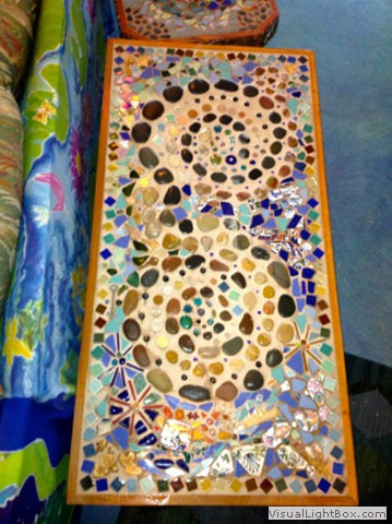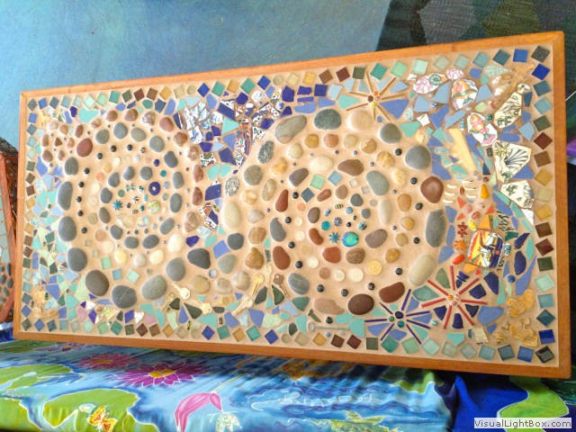 To name some of the items: coins from every trip & country friends, family and myself have toured, lots of remote island beach glass & a vast variety of shoreline treasures, driftwood, beach & river rocks, beads & marbles new & old, broken jewellery pieces, many gem & mineral specimens, cosmic crystals infused with positive intentions, metal art, broken tiles & dishes, pounds of special glue & much more ... nothing goes to waste with a space like this ...